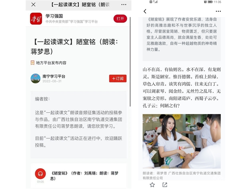 軌道地產(chǎn)商業(yè)公司黨支部蔣夢思同志參加了此次活動,她朗讀的作品《陋室銘》經(jīng)南寧軌道交通集團(tuán)推選,榮登“學(xué)習(xí)強國”平臺,在“一起讀課文”欄目展播。