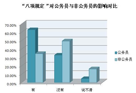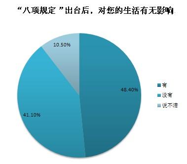截至2013年12月20日10時(shí),共收到網(wǎng)絡(luò)問卷2442份,48.4%的受訪者認(rèn)為“八項(xiàng)規(guī)定”對個(gè)人生活有影響,其中公務(wù)員群體認(rèn)為“八項(xiàng)規(guī)定”帶來的最大影響是“公務(wù)吃請少了,能抽出更多時(shí)間陪伴家人”和“津貼補(bǔ)貼獎(jiǎng)金少了,勒緊褲帶過日子”,非公務(wù)員群體認(rèn)為“八項(xiàng)規(guī)定”帶來的最大影響是“酒店、高端會所門外的公務(wù)用車少了”和“遇到領(lǐng)導(dǎo)考察工作時(shí),地毯鮮花迎送領(lǐng)導(dǎo)的情況少了”。