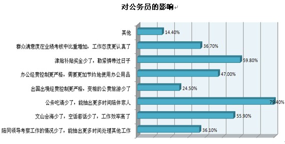 “八項(xiàng)規(guī)定”的執(zhí)行給公務(wù)員帶來的最大影響是什么?本次調(diào)查中,排名前三位的影響依次是“公務(wù)吃請少了,能抽出更多時(shí)間陪伴家人”(79.4%)、“津貼補(bǔ)貼獎(jiǎng)金少了,勒緊褲帶過日子”(59.8%)和“文山會海少了,空話套話少了,工作效率高了”(55.9%)。
