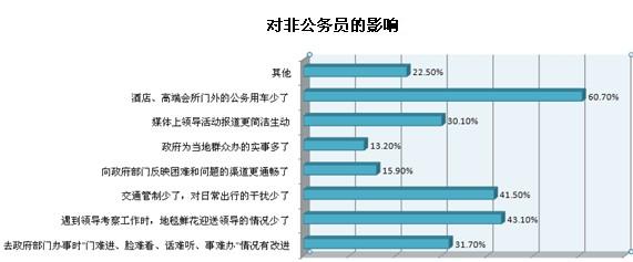 還有三到五成受訪公務(wù)員認(rèn)為“辦公經(jīng)費(fèi)控制更嚴(yán)格,需要更加節(jié)約地使用辦公用品”、“群眾滿意度在業(yè)績考核中比重增加,工作態(tài)度更認(rèn)真了”和“陪同領(lǐng)導(dǎo)考察工作的情況少了,能抽出更多時(shí)間處理其他工作”是“八項(xiàng)規(guī)定”帶來的幾大影響。