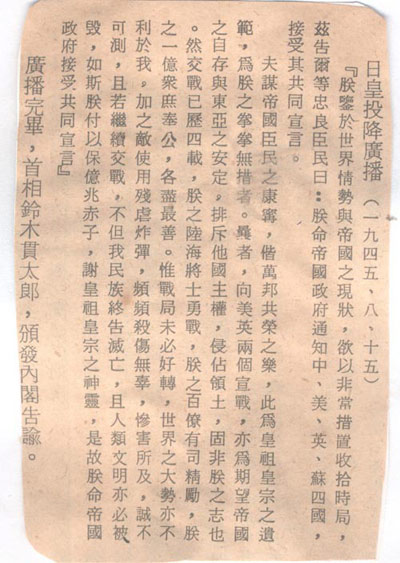 1945年8月15日日本天皇投降廣播詞。這篇文告是告訴自己的老百姓(忠良臣民)的。其中對(duì)于發(fā)動(dòng)戰(zhàn)爭(zhēng)的罪責(zé)不但沒有一個(gè)字的自責(zé),而且指“敵使用殘虐炸彈,頻頻殺傷無(wú)辜,慘害所及,誠(chéng)不可測(cè)!焙褪嗄旰笏l(fā)現(xiàn)的東條英機(jī)遺囑的惡劣態(tài)度如出一轍。廣大網(wǎng)友不放回頭看看2013年12月12日18:21:31《歷史鐵證日本400年侵華野心,讓我們恨搗靖國(guó)神社內(nèi)幕吧!》一文中東條英機(jī)的遺囑。
