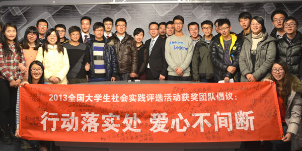人民網(wǎng)北京1月15日電 (記者 張葳)1月15日,2013全國(guó)大學(xué)生社會(huì)實(shí)踐評(píng)選活動(dòng)舉行頒獎(jiǎng)和座談活動(dòng),獲獎(jiǎng)大學(xué)生代表上百個(gè)團(tuán)隊(duì)發(fā)表了倡議書(shū),號(hào)召全國(guó)大學(xué)生們?cè)谏鐣?huì)實(shí)踐中做到“行動(dòng)落實(shí)處,愛(ài)心不間斷”,經(jīng)常性、持續(xù)性地走進(jìn)社會(huì)、服務(wù)基層,拒絕形式主義。