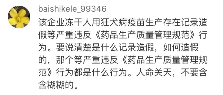 網友“baishikele_99346”認為:“要說清楚是什么記錄造假,如何造假的,那個等嚴重違反《藥品生產質量管理規(guī)范》行為的都是什么行為。人命關天,不要含含糊糊。”