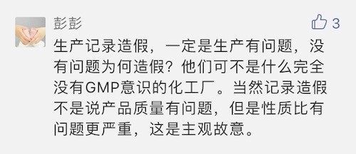 也有網友認為:“生產記錄造假一定是生產有問題,沒問題為什么造假?他們可不是沒有GMP意識的化工廠。當然記錄造假不是說產品質量有問題,但是性質比問題更嚴重,這是主觀故意!