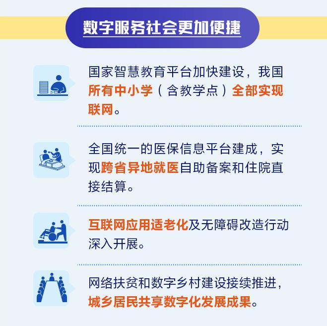 與此同時(shí),《報(bào)告》介紹,在數(shù)字服務(wù)社會(huì)方面,國(guó)家智慧教育平臺(tái)加快建設(shè),我國(guó)所有中小學(xué)(含教學(xué)點(diǎn))全部實(shí)現(xiàn)聯(lián)網(wǎng)。全國(guó)統(tǒng)一的醫(yī)保信息平臺(tái)建成,實(shí)現(xiàn)跨省異地就醫(yī)自助備案和住院直接結(jié)算。互聯(lián)網(wǎng)應(yīng)用適老化及無障礙改造行動(dòng)深入開展。網(wǎng)絡(luò)扶貧和數(shù)字鄉(xiāng)村建設(shè)接續(xù)推進(jìn),城鄉(xiāng)居民共享數(shù)字化發(fā)展成果。